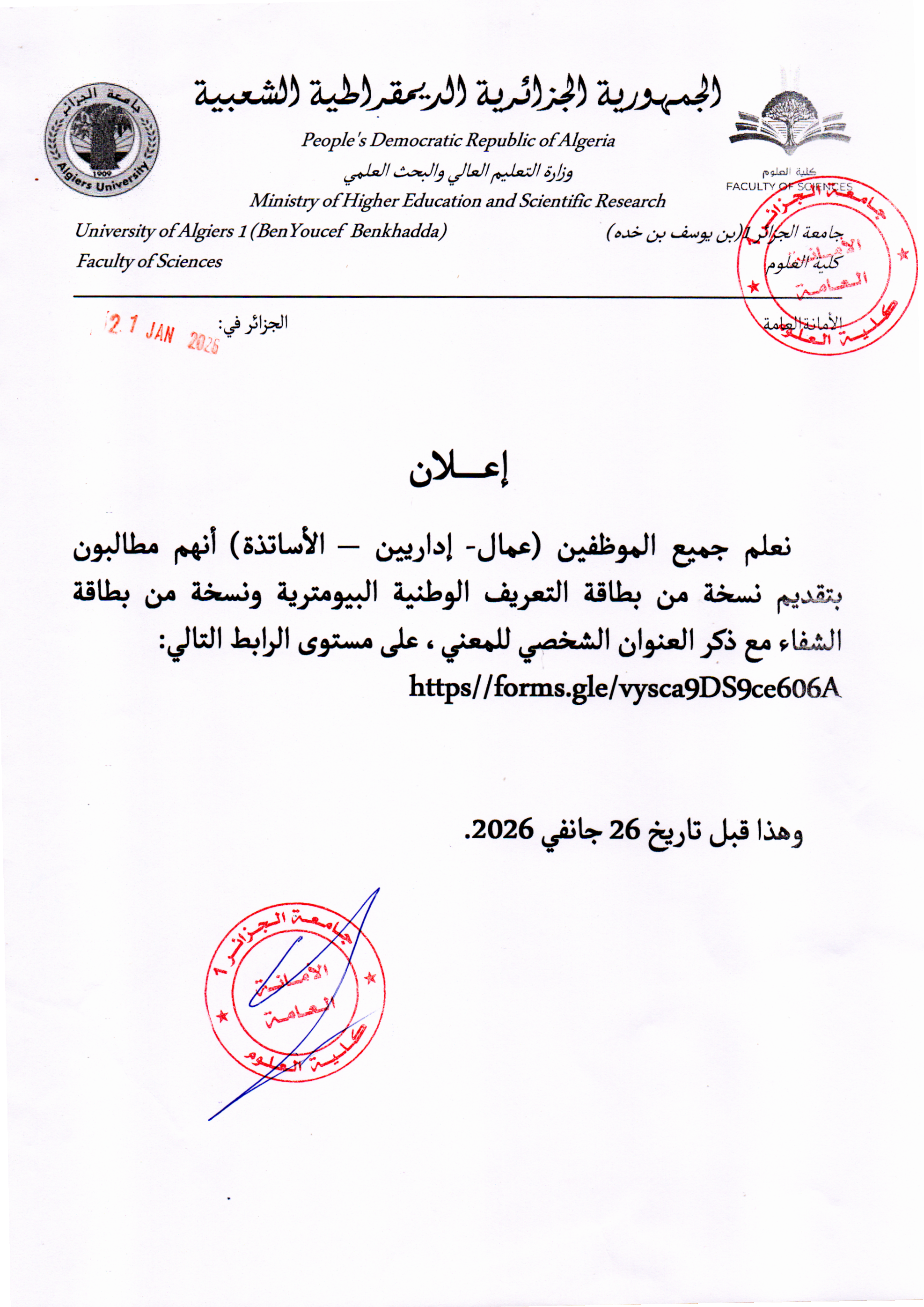 إعلان هام لجميع عمال وأساتذة كلية العلوم